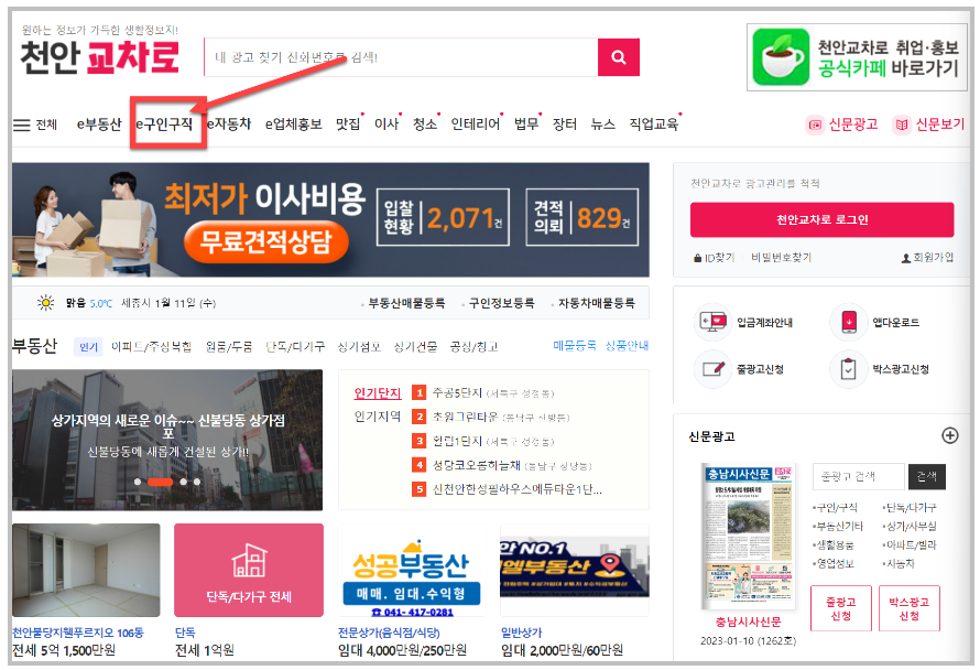위 화면과 같은 천안교차로 홈페이지에 접속했다면 맞게 접속한 것입니다. 여기서 사진에 표시한 것처럼 전체 메뉴에서 ‘구인구직’을 클릭하면 우리가 원하는 웹사이트로 로 이동할 수 있습니다. 또는 아래 링크를 통해서 한번에 이동할 수 있습니다.