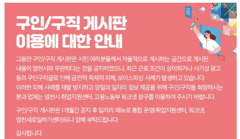 그리고 최근에 영천시홈페이지 구인구직 게시판을 들어가보니 더이상 일자리 게시판을 이용할 수 없다는 안내창을 확인할 수 있었습니다. 아무래도 지자체에서 관리하는 것이 아니라 시민이 자율적으로 올릴 수 있는 공간이기에 불법적인 사기 광고나 반복적인 게시글이 많았다고 합니다. 그래서 이러한 이유들로 더이상 운영하지 않는 것으로 결정이 내려진 것 같습니다.