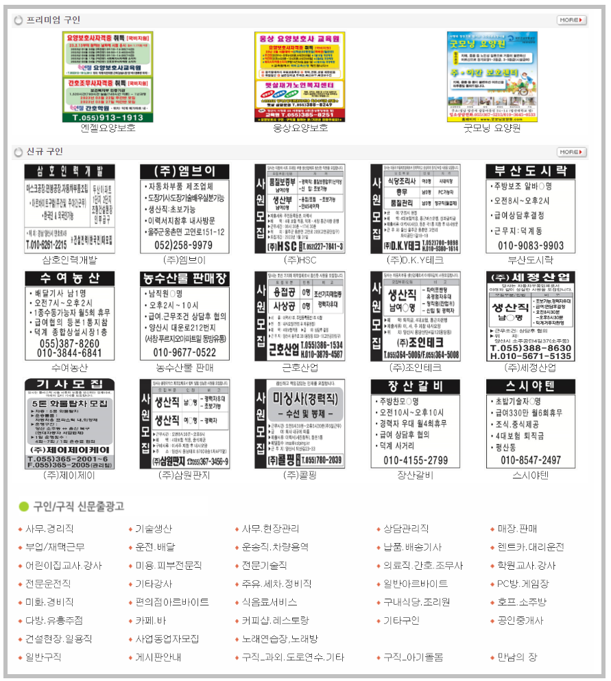 사실 이렇게 분류한 것도 이해할 수 있는 것은 필터링이 필요할 만큼 많은 구인공고가 올라오지 않기 때문입니다. 각 직종멸 2-3개 정도의 글이 평균적으로 있고, 아예 글이 없는 곳도 있습니다. 따라서 웅상소식에서 일자리를 구한다면 신규 구인을 더 찾아보는 것을 추천합니다.