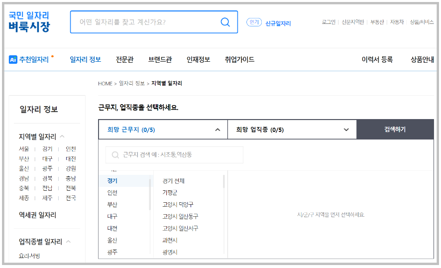 그중 이번 포스팅의 주제인 구인구직을 클릭하면 필터링된 상태의 일자리 정보를 얻을 수 있습니다.