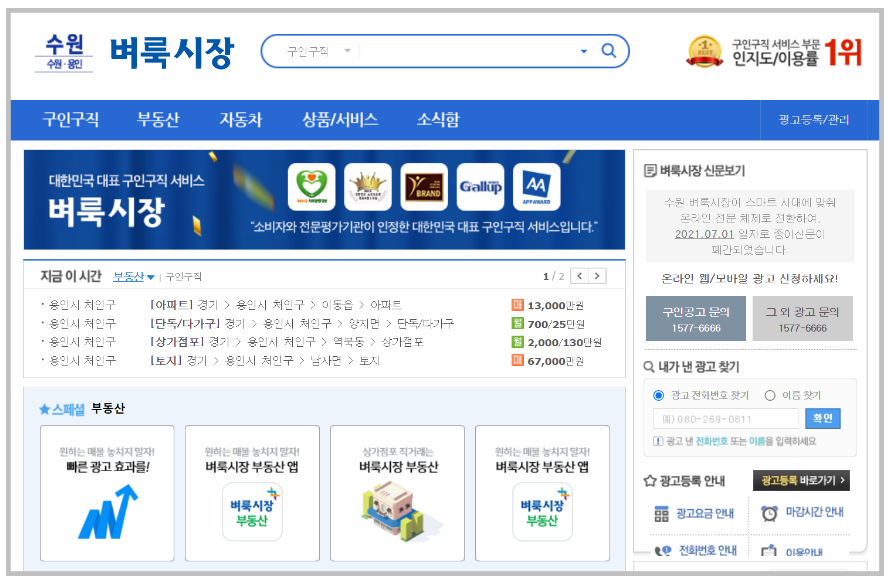 수원용인 벼룩시장의 홈페이지 모습은 다음과 같습니다. 구인구직, 부동산, 자동차, 상품 등 다양한 카테고리를 운영하고 있는 것을 확인할 수 있습니다. 벼룩시장은 특히나 앱이 잘 되어있어서 앱을 통해서도 구인구직, 부동산, 자동차 정보를 볼 수 있습니다.