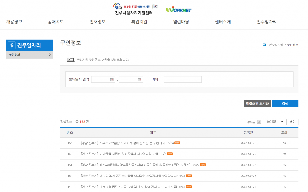 각 지자체에서는 홈페이지에서 취업 게시판을 운영하고 있습니다. 매일같이 새 게시물이 올라오며 워크넷과 같이 협업하는 만큼 믿을만한 곳이라고 생각됩니다. 등록일자 또는 키워드 검색을 통해 찾아볼 수 있으니 참고하시길 바랍니다.
