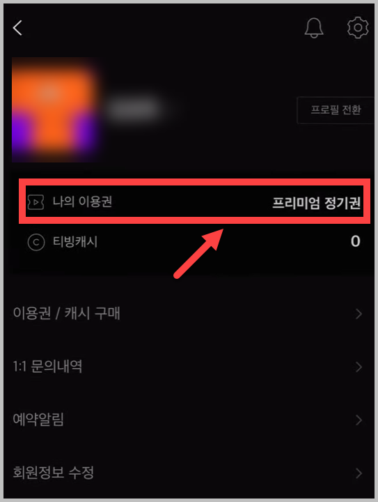 • '나의 이용권' 선택: 'MY' 페이지로 이동하면 '나의 이용권' 메뉴가 보입니다. 이 메뉴를 선택합니다.