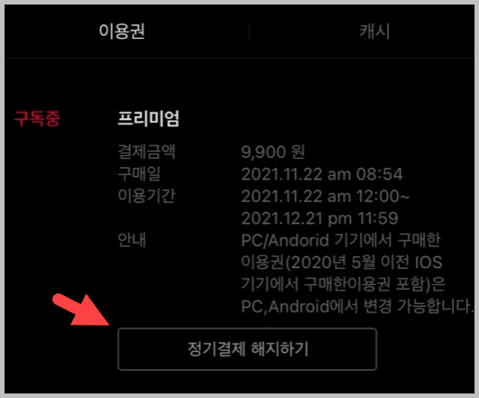 • '정기결제 해지하기': 이용권 상세 정보가 나타나면 '정기결제 해지하기' 버튼을 누릅니다.