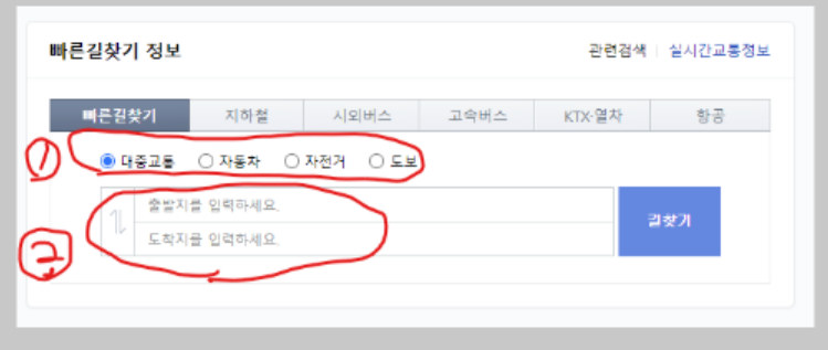 - 이동할 교통수단을 선택합니다. 자동차, 대중교통(버스·지하철), 자전거, 도보 중 하나를 고릅니다.