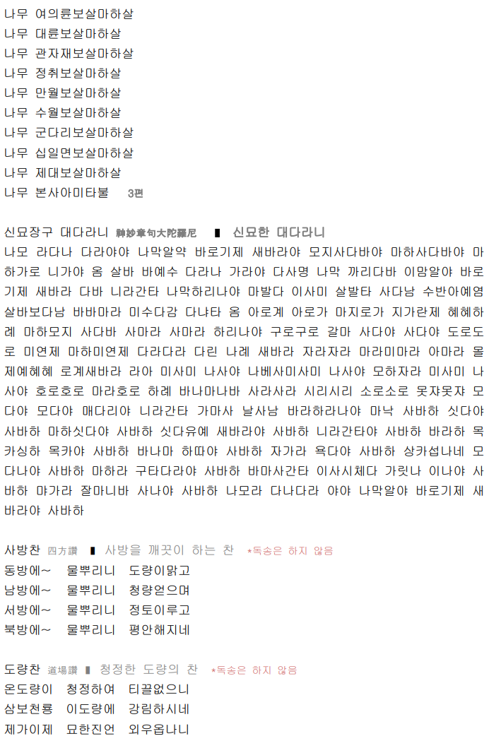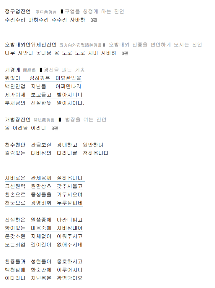 오늘날 사찰뿐 아니라 가정에서도 우리말 천수경을 독송하는 분들이 많습니다. 어렵게 느껴졌던 경전이 한글로 풀어지면서 더 가까워졌기 때문입니다. 천수경은 관세음보살의 자비를 기리는 동시에, 내가 관음의 마음을 닮아가겠다고 서원하는 경전입니다. 우리말 원문을 천천히 읽어 보면, 단순한 주문이 아니라 삶의 태도를 바꾸는 가르침이 담겨 있음을 알 수 있습니다. 그래서 천수경은 지금도 많은 불자들의 일상 수행 속에서 이어지고 있습니다.