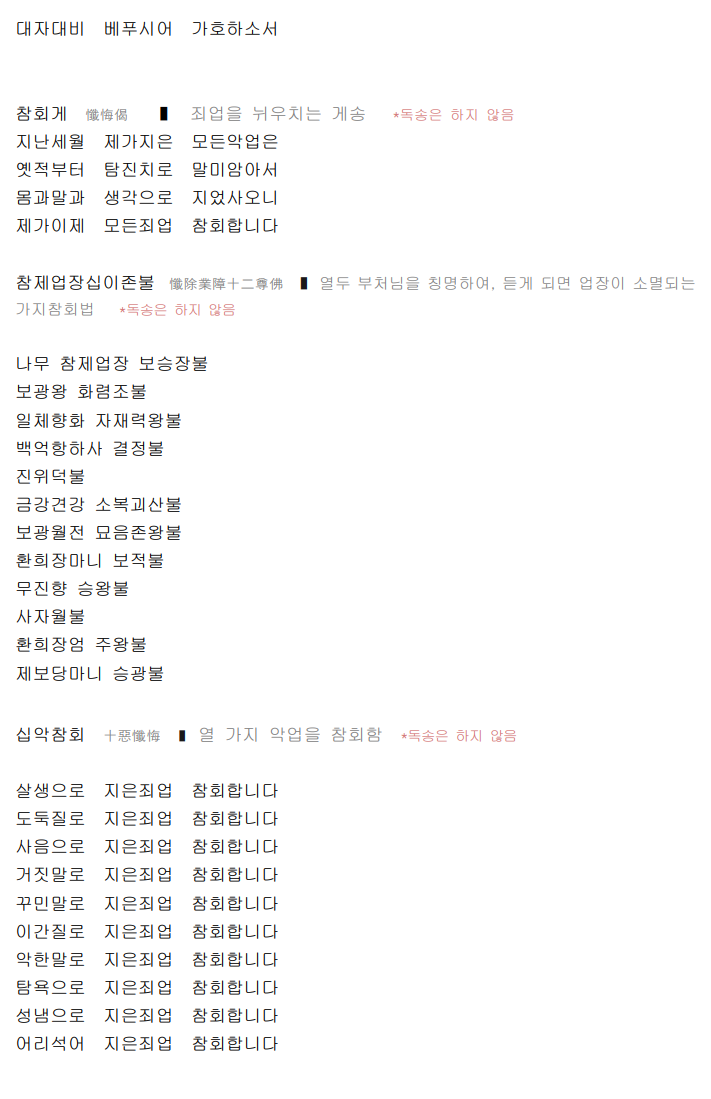 특히 우리말로 독송할 때는 의미가 더 또렷하게 다가옵니다. 한문으로만 읽으면 소리의 울림에 집중하게 되지만, 우리말로 읽으면 한 구절 한 구절의 뜻을 마음에 새길 수 있습니다. 예를 들어 “죄에는 본래 성품이 없고 마음 따라 일어난다”는 대목은 불교의 공 사상을 쉽게 이해하도록 돕습니다. 죄와 번뇌도 고정된 실체가 아니라 마음의 작용이라는 점을 알게 되면, 자괴감과 두려움에서 벗어나 새롭게 출발할 수 있다는 메시지를 전합니다.